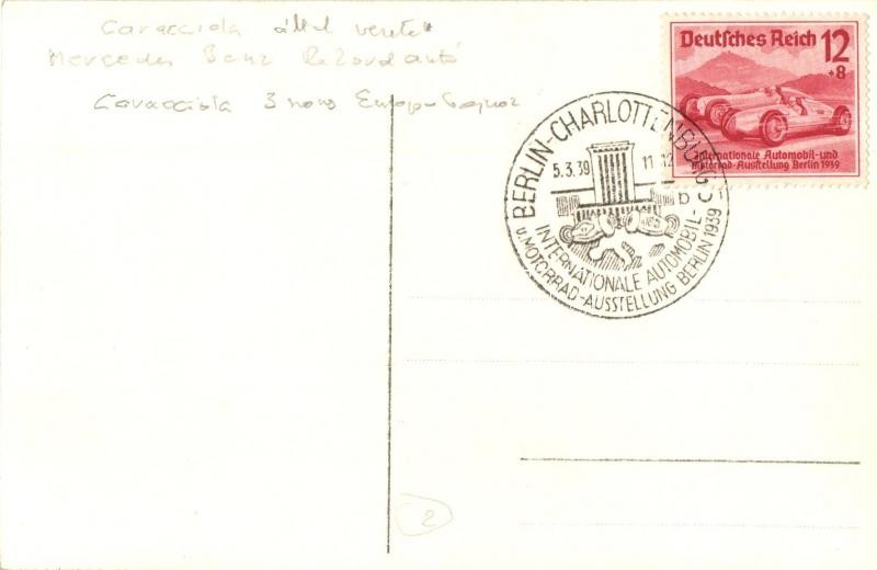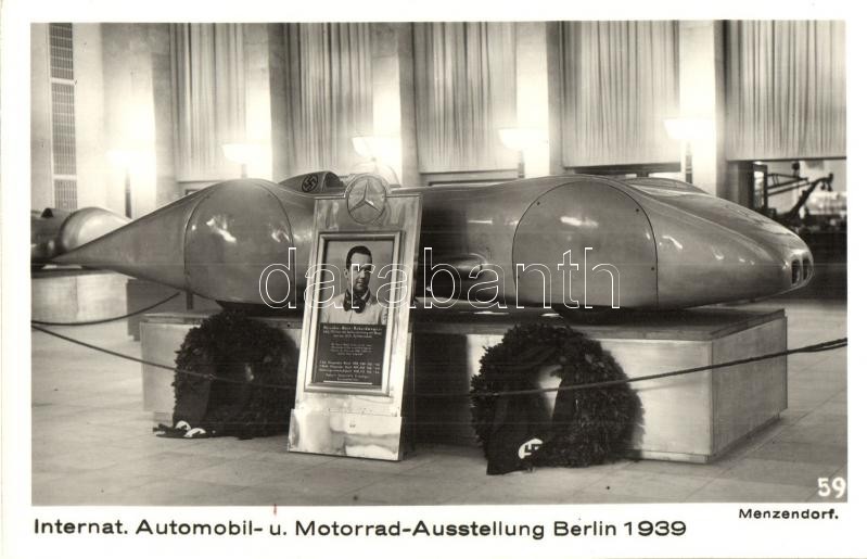 1939 International Automobil-Ausstellung Berlin, Mercedes-Benz-Rekordwagen, Foto der Fahrer und 3-malige Europameister Rudolf Caracciola / International Automobile Exhibition in Berlin, Rudolf Caracciola's photo in front of the racecar in which he reached record speed in 1938 (overthrow only in 2017). Menzendorf, So. Stpl / Rudolf Caracciola képe a Mercedes-Benz versenyautó előtt, amivel 1938-ban rekordsebességet ért el (ezt csak 2017-ben sikerült megdönteni)