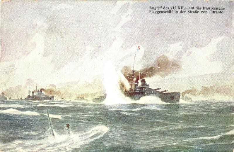 Angriff des "U XII" auf das französische Flaggenschiff in der Strasse von Otranto / WWI K.u.K. Kriegsmarine, Austro-Hungarian Navy's SM U-12 submarine and French Navy fleet in the battle of Otranto. Rotes Kreuz, Kriegsfürsorgeamt Kriegshilfsbüro Nr. 33.