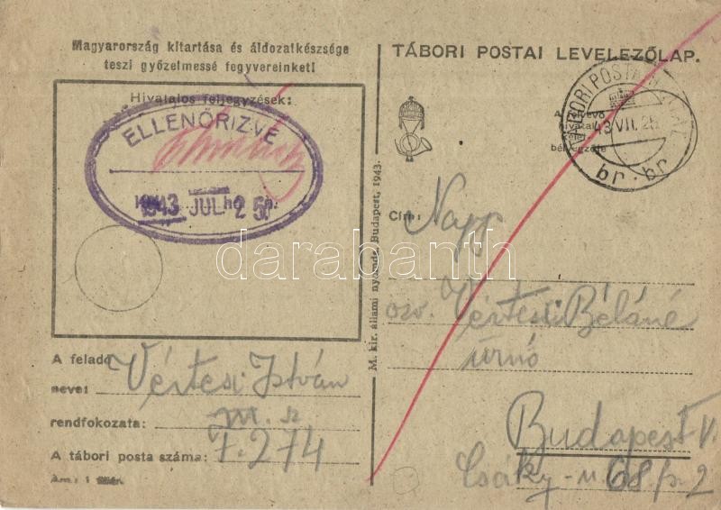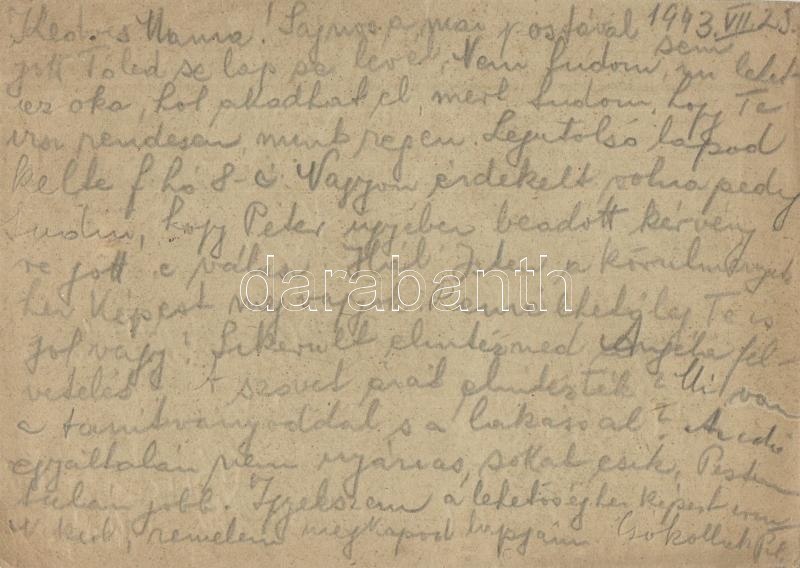 1943 Vértesi István zsidó KMSZ (közérdekű munkaszolgálatos) levele édesanyjának özv. Vértesi Béláné úrnőnek. m. sz. F 274. / WWII Letter of a Jewish labor serviceman to his mother. Judaica (EK)