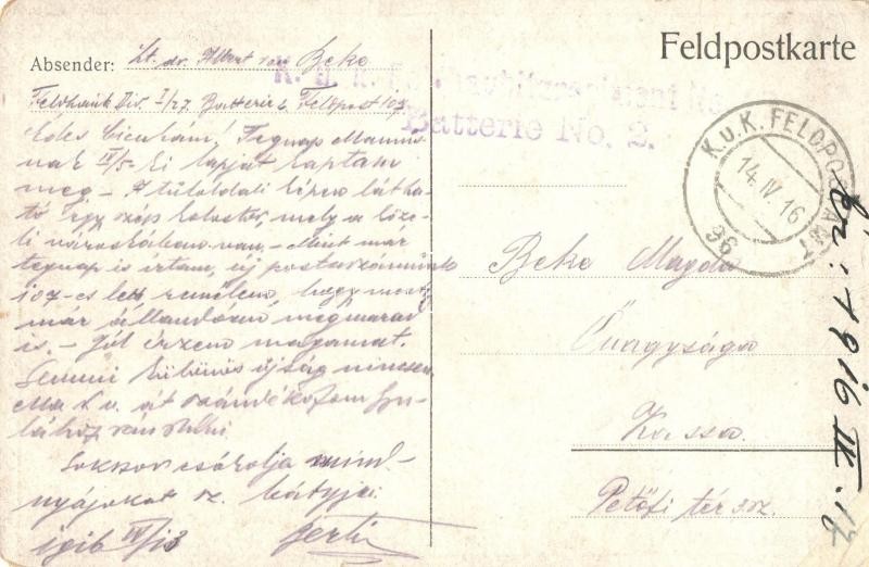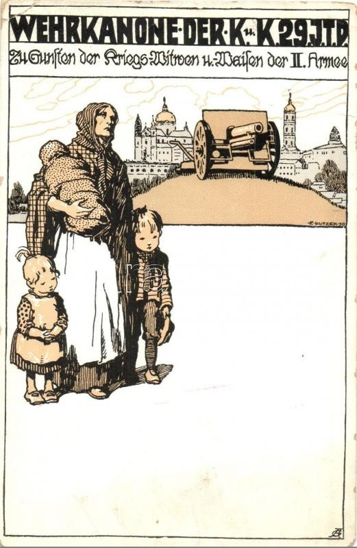 Wehrkanone der K.u.K. 29. I. T. D. zugunsten der Kriegs-Witwen und Waisen der II. Armee / WWI Austro-Hungarian K.u.K. military cannon, charity art postcard. s: E. Kutzer + K.u.K. Feldbaubitzregiment No. 27. Batterie No. 2. (r)