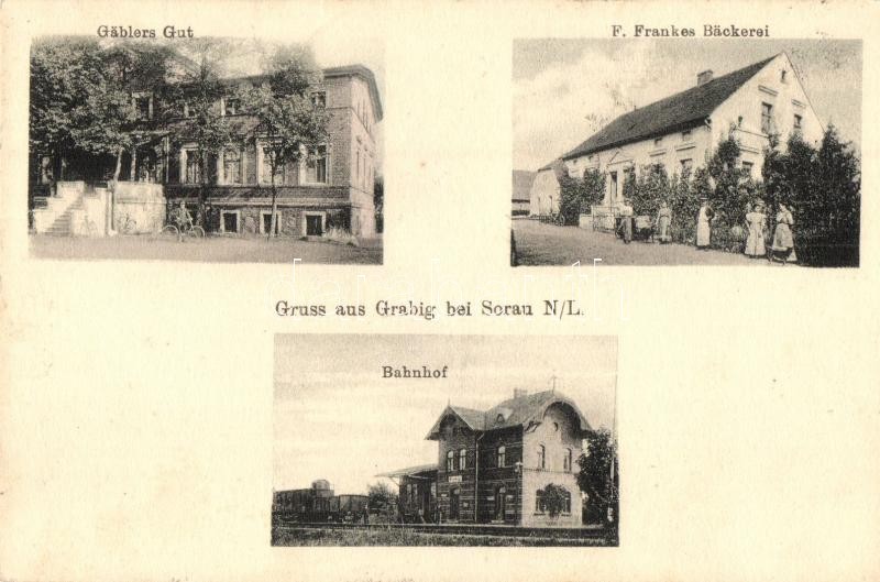 Leírás: 1923 Grabik (Zary), Grabig bei Sorau; Gäblers Gut, F. Frankes Bäckerei, Bahnhof / villa, backery, railway station