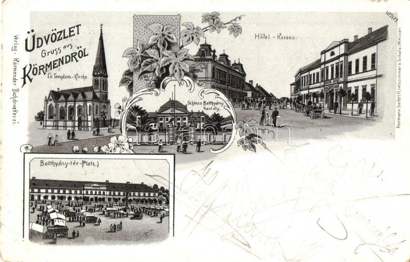 Leírás: 1899 Körmend, Korona szálloda, Evangélikus templom, Batthyány kastély és tér. Floral, Art Nouveau, litho (EK)