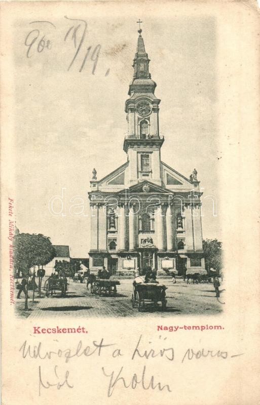 1900 Kecskemét, Nagy templom, szekerek. Kiadja Fekete Mihály (kis saro... https://www.darabanth.com/hu/330-Gyorsarveres/330.0/Kepeslapok/Magyarorszag~2000004/1900-Kecskemet-Nagy-templom-szekerek-Kiadja-Fekete-Mihaly-kis-sarokhiany-small-corner-short~II1840877