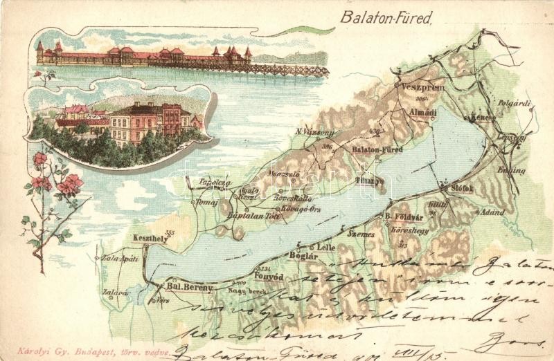 Leírás: 1901 Balatonfüred, Balaton térkép, szálloda, villa, fürdő. Kiadja Károlyi Gy. Floral, Art Nouveau, litho