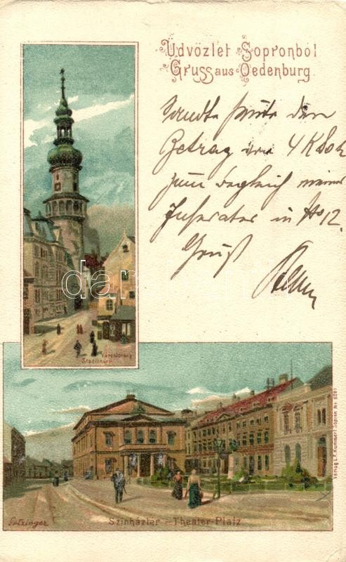 1901 Sopron, Oedenburg; Várostorony, Színház tér. L. F. Kummert Nr. 62... https://www.darabanth.com/hu/330-Gyorsarveres/330.0/Kepeslapok/Magyarorszag~2000004/1901-Sopron-Oedenburg-Varostorony-Szinhaz-ter-L-F-Kummert-Nr-6201-litho-s-Gotzinger-E~II1550919