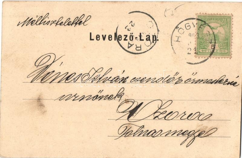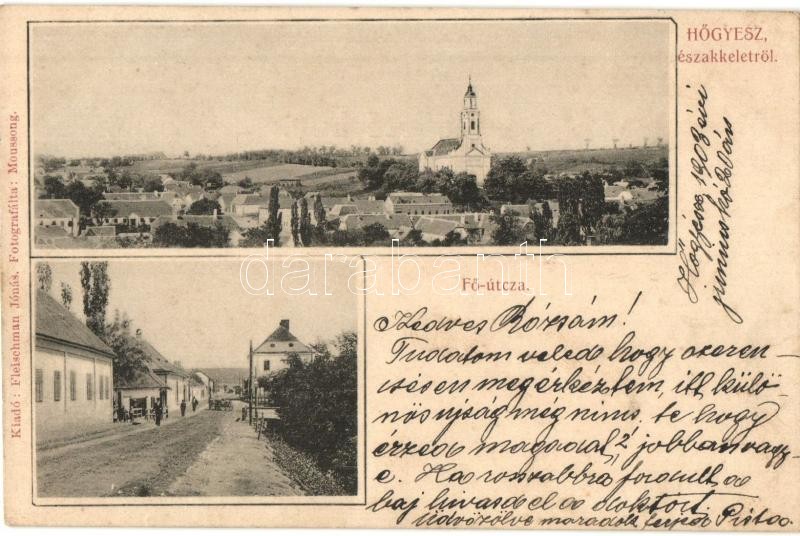 Leírás: 1903 Hőgyész, látkép északkeletről, Római katolikus templom, Fő utca. Kiadja Fleischmann Jónás, fotografálta Moussong (apró szakadás / tiny tear)