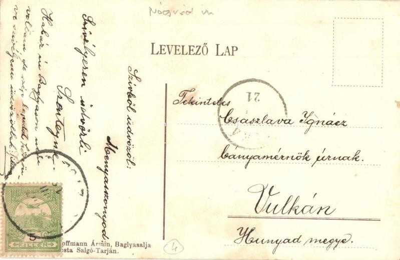Leírás: 1907 Baglyasalja (Salgótarján), Albert akna, bánya, iparvasút, csillék. Kiadja Hoffmann Ármin (EK)