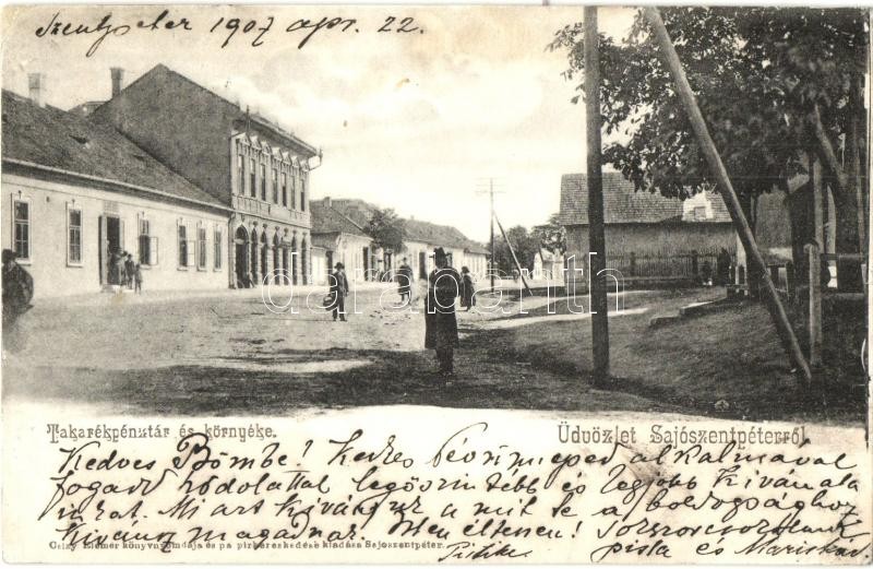 Leírás: 1907 Sajószentpéter, Takarékpénztár és környéke, utcakép, üzlet. Kiadja Csizy Elemér (r)