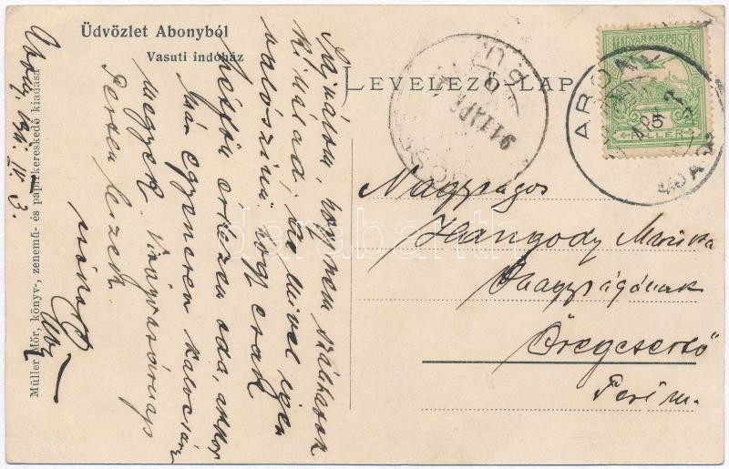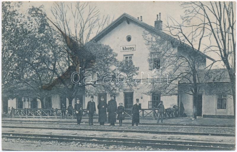 Leírás: Abony, Vasúti indóház, vasútállomás, vasutasok. Kiadja Müller Mór (EK)