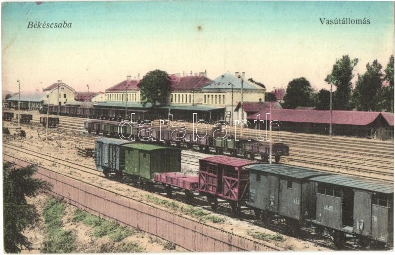 Békéscsaba, Vasútállomás, vagonok. Holländer nyomda kiadása https://www.darabanth.com/hu/330-Gyorsarveres/330.0/Kepeslapok/Magyarorszag~2000004/Bekescsaba-Vasutallomas-vagonok-Hollander-nyomda-kiadasa~II1843006
