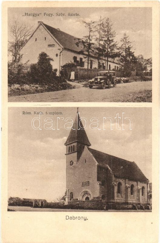 Leírás: Dabrony, Hangya fogyasztási szövetkezet üzlete, automobil, Római katolikus templom. Hangya szövetkezet saját kiadása