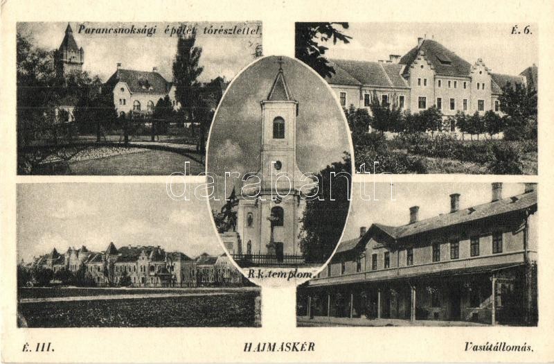 Leírás: Hajmáskér, vasútállomás, Parancsnoksági épület, É. III és 6., Római katolikus templom