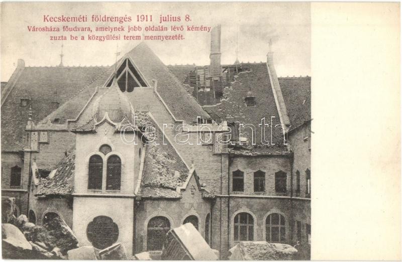 Kecskemét, a kecskeméti városháza az 1911. július 8-ai földrengés után, a főudvar, amelynek jobb oldalán lévő kémény zúzta be a közgyűlési terem mennyezetét. Fantó fényképész felvétele