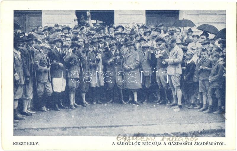 Keszthely, A sárgulók (végzős hallgatók) búcsúja a Gazdasági Akadémiát... https://www.darabanth.com/hu/330-Gyorsarveres/330.0/Kepeslapok/Magyarorszag~2000004/Keszthely-A-sargulok-vegzos-hallgatok-bucsuja-a-Gazdasagi-Akademiatol-Studentika-Bal~II1840890