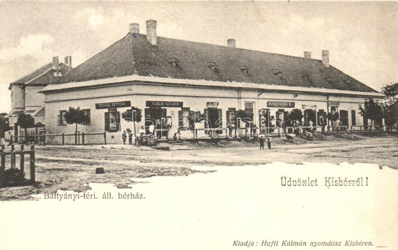 Leírás: Kisbér, Batthyány tér, állami bérház, Rosenberg és Török István kereskedései. Kiadja Haftl Kálmán nyomdász
