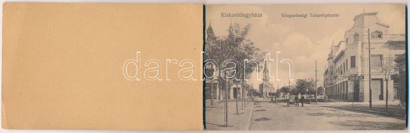 Leírás: Kiskunfélegyháza, hiányos leporelló füzet 5 db képeslappal: Közgazdasági Takarékpénztár, Szélmalom, római katolikus templom, Kossuth utca, városháza