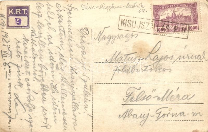 Leírás: Kisújszállás, Piac tér árusokkal, templom, az előtérben kihirdetés és felolvasás rendőr jelenlétében, helypénz szedése, fiú órával (EK)