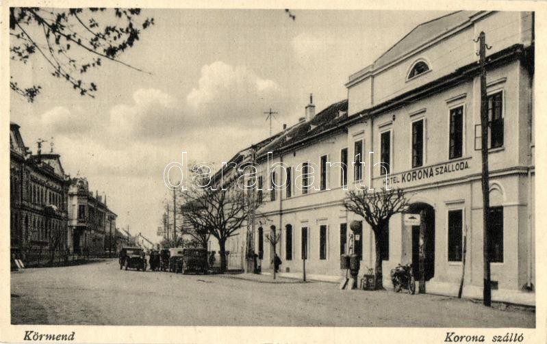 Leírás: Körmend, Hotel Korona szálloda és kávéház, hintók, automobil, motorkerékpár