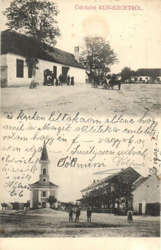 Leírás: Kunsziget, utcakép, Singer Lajos üzlete, hintó, Római katolikus templom. Singer Lajos saját kiadása
