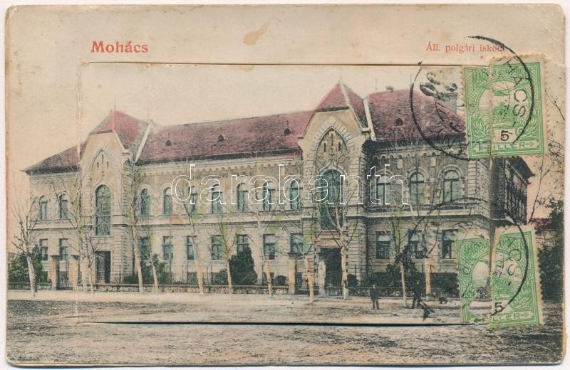 Mohács, Állami polgári iskola. leporello, belül: Király utca, Hajószentelés, Mohácsi csata, Széchenyi tér, Posta hivatal, Kardos Kálmán utca, vízhordó lányok, Központi szálloda, selyemfonoda. W. L. Bp. 940. Kiadja Pollák Róbert (szakadás / tear)