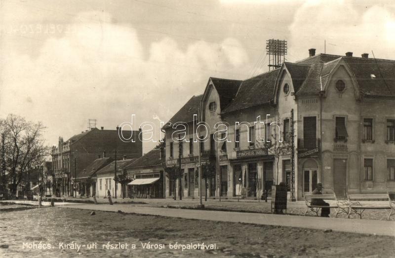Mohács, Király út a városi bérpalotával, Schmidt gyógyszertár, Dunavidék, Pollak Róbert, Fischer Imre, Adler József, Molnár László üzlete. Pollák Róbert saját kiadása (fl)