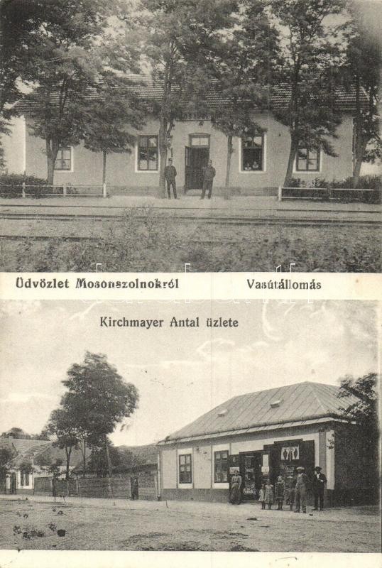 Leírás: Mosonszolnok, Vasútállomás, vasutasok, utcakép, Kirchmayer Antal üzlete és saját kiadása (EK)