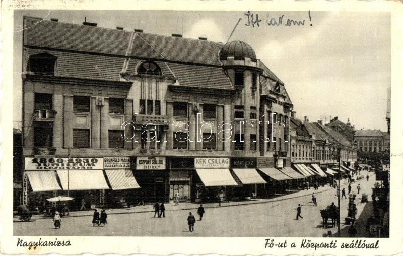 Leírás: Nagykanizsa, Fő út, Hotel Központi szálloda, 1860-1930 Jubileumi olcsó vásár, Grünfeld Márk üzlete, Kék Csillag divatáruház, kávéház (EK)