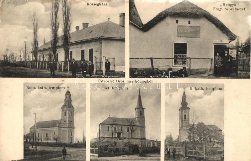Oros (Nyíregyháza), Községháza, Római katolikus templom, Református templom, Görögkatolikus templom, Hangya szövetkezet üzlete. Szilágyi Arthur műterméből (EK)