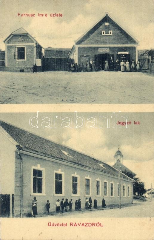 Ravazd, Jegyző lak, Karhusz Imre szatócs üzlete és saját kiadása https://www.darabanth.com/hu/330-Gyorsarveres/330.0/Kepeslapok/Magyarorszag~2000004/Ravazd-Jegyzo-lak-Karhusz-Imre-szatocs-uzlete-es-sajat-kiadasa~II1843312
