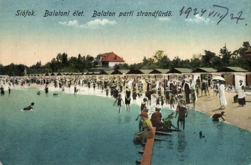 Leírás: Siófok, Balatoni élet, fürdőzők a strandon, kabinok (EK)