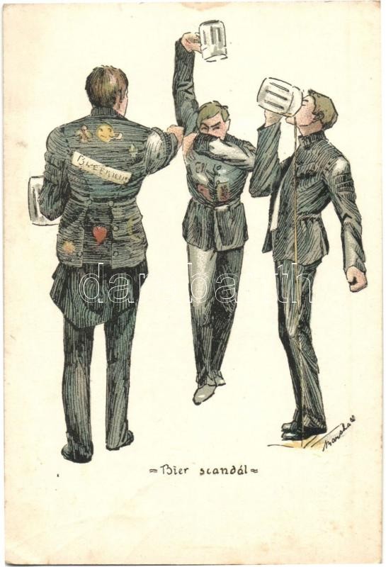 Leírás: Sopron, Oedenburg; A Selmeci Diákéletből XIII. Bier scandál. Röttig-Romwalter nyomda rt. Studentika / Studentica art postcard s: Bartha L. (EK)