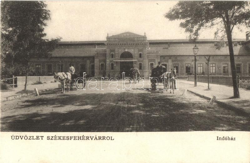 Székesfehérvár, Indóház, vasútállomás, lovaskocsik, konflisok https://www.darabanth.com/hu/330-Gyorsarveres/330.0/Kepeslapok/Magyarorszag~2000004/Szekesfehervar-Indohaz-vasutallomas-lovaskocsik-konflisok~II1843459