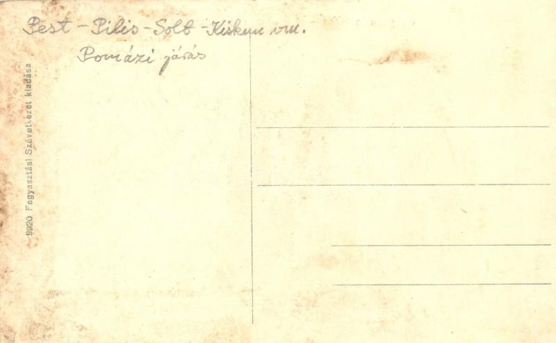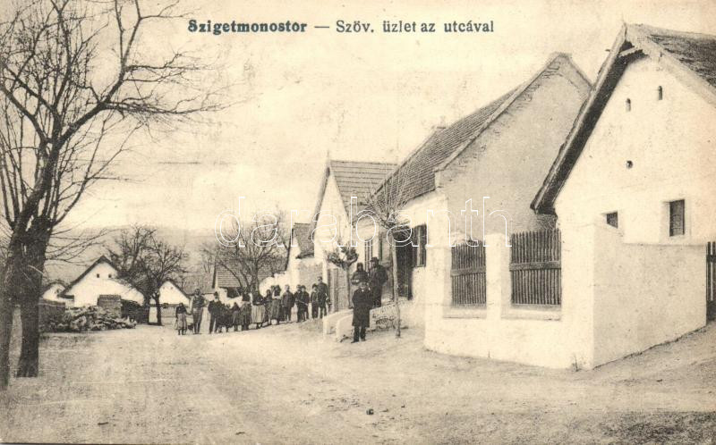 Leírás: Szigetmonostor, utcakép, Fogyasztási szövetkezet üzlete és saját kiadása (fl)