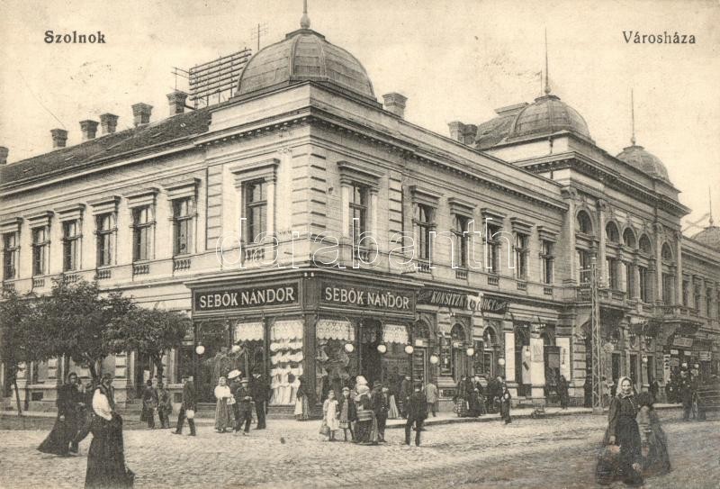 Szolnok, Városháza, utcakép, Sebők Nándor és Konsitzky György üzlete. ... https://www.darabanth.com/hu/330-Gyorsarveres/330.0/Kepeslapok/Magyarorszag~2000004/Szolnok-Varoshaza-utcakep-Sebok-Nandor-es-Konsitzky-Gyorgy-uzlete-Gero-Ignac-kiadasa~II1574960