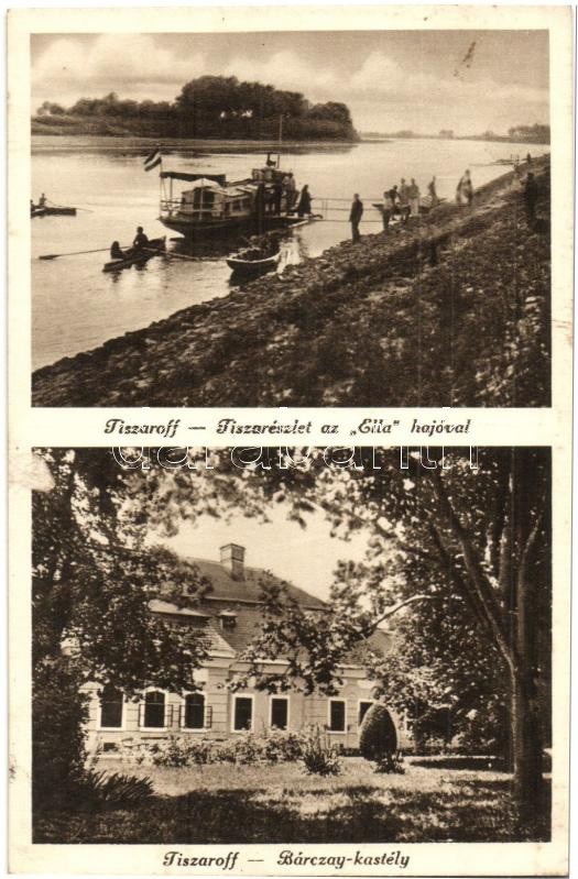 Leírás: Tiszaroff, Tisza részlet evezősökkel és az "Ella" személyszállító motorhajóval, Bárczay kastély. Kiadja Lénárt D. (EK)