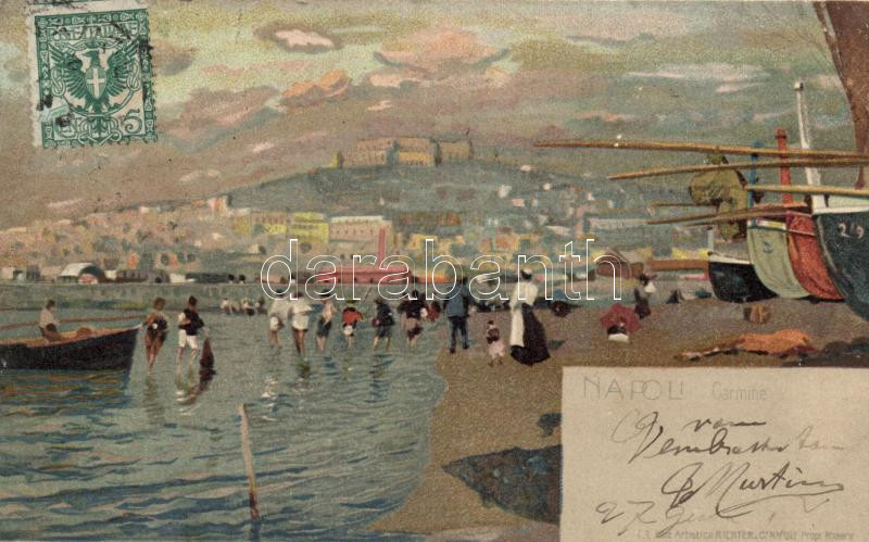 Leírás: Naples, Napoli; Carmine, beach, boats, bathers (EB)