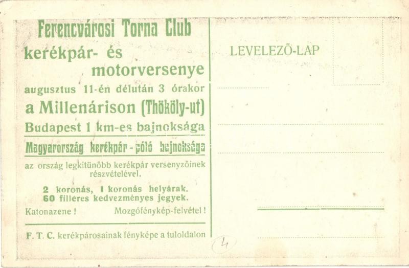 A Ferencvárosi Torna Club (FTC, Fradi) kerékpárosainak fényképe, a hátoldalon kerékpár- és motorverseny hirdetés / Group picture of the bikers of the FTC sports club, bicycle and motorcycle championship advertisment on backside (EK)