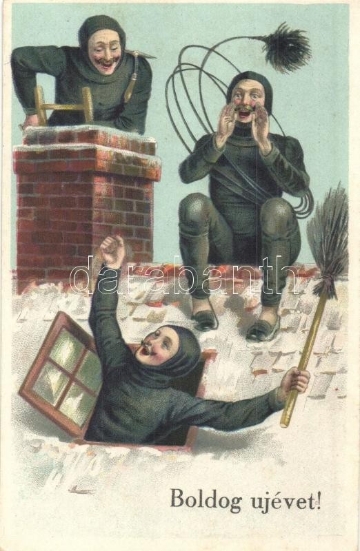 Boldog Újévet! / New Year greeting card, chimney sweepers. litho https://www.darabanth.com/hu/330-Gyorsarveres/330.0/Kepeslapok/Udvozlolapok-Unnepek~2000072/Boldog-Ujevet-New-Year-greeting-card-chimney-sweepers-litho~II1840278