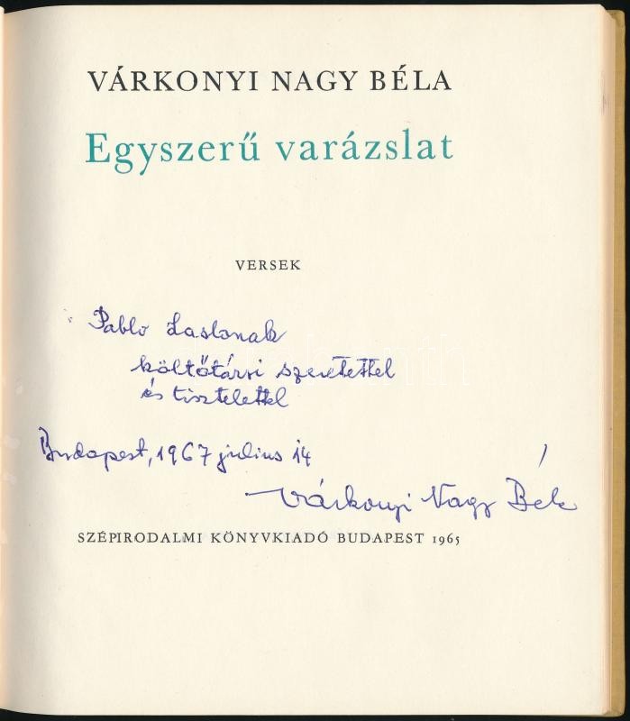 Leírás: Várkony Nagy Béla: Egyszerű varázslat. Versek. Bp.,1965, Szépirodalmi. Kiadói egészvászon-kötés. A szerző által dedikált.
