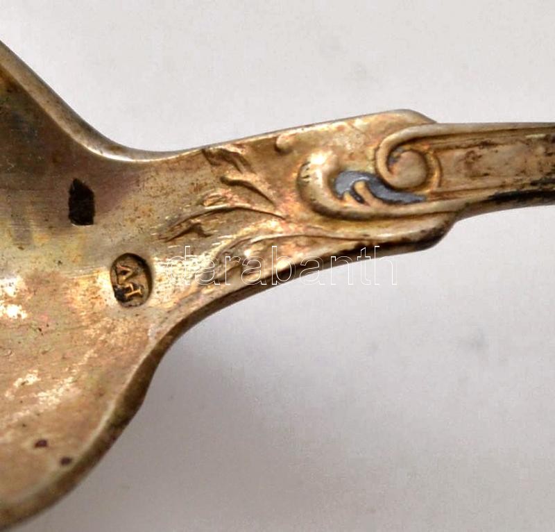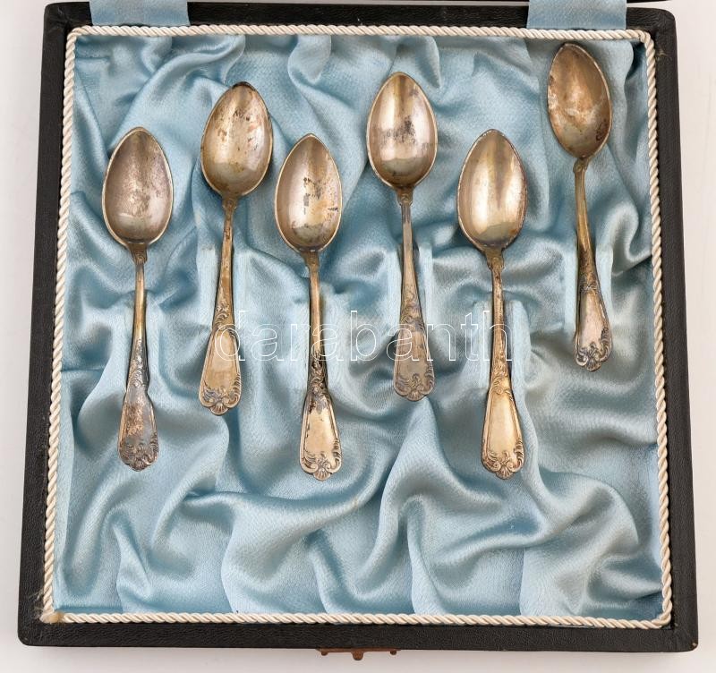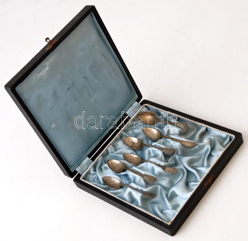 Leírás: Ezüst (Ag.) mokkás kanál készlet (6 db), jelzett, dobozban, h: 10,5 cm (6×), nettó:76 g