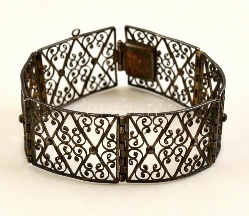 Ezüst(Ag) filigrán karkötő, jelzett, h: 19 cm, nettó: 22,1 g https://www.darabanth.com/hu/330-Gyorsarveres/330.0/Nemesfem-Disztargyak-Orak-es-Ekszerek/Nemesfem-Disztargyak-Orak-es-Ekszerek~2000081/EzustAg-filigran-karkoto-jelzett-h-19-cm-netto-22-1-g~II1839635