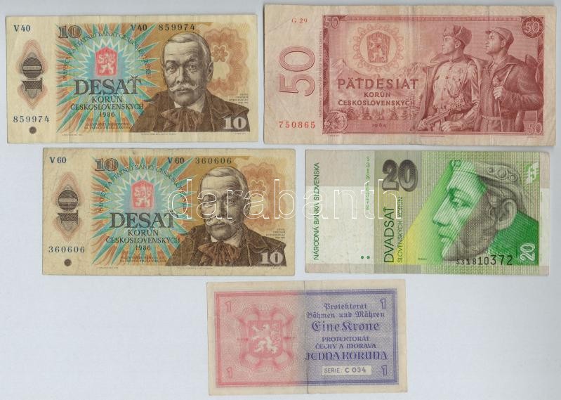 Leírás: Vegyes: Német Harmadik Birodalom / Cseh-Morva Protektorátus 1940. 1K + Csehszlovákia 1964. 50K + 1986. 10K (2x) + Szlovákia 2004. 20K T:III,III-