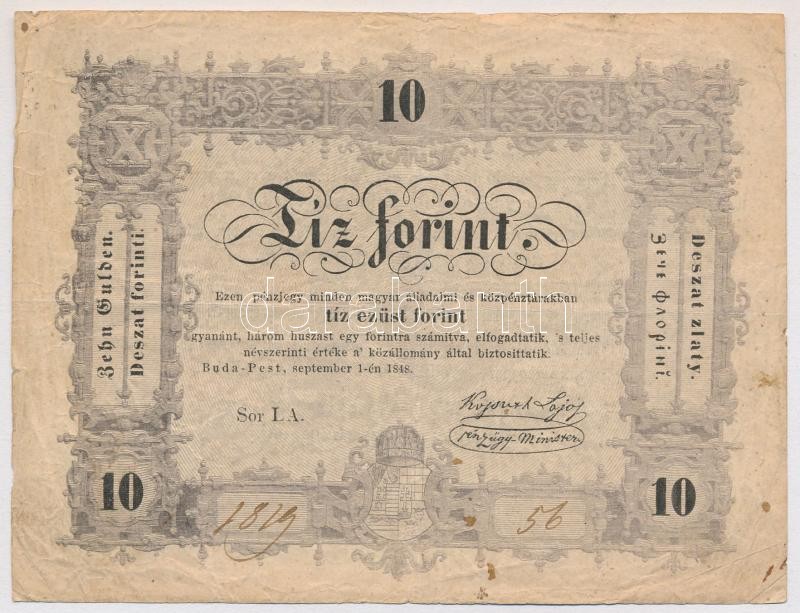 Adamo G111 https://www.darabanth.com/hu/330-Gyorsarveres/330.0/Numizmatika/Magyar-bankjegyek~1000006/1848-10Ft-Kossuth-Banko-TIII--Adamo-G111~II1842395