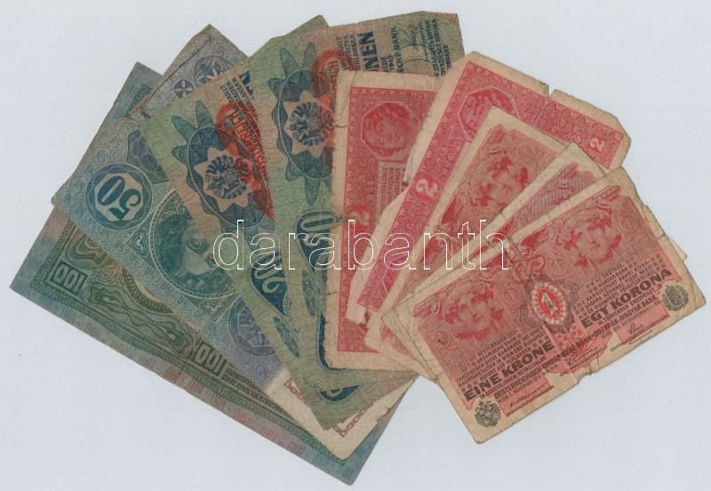 Leírás: 1912-1917. 1K-100K (9x) több darabon "DEUTSCHÖSTERREICH" felülbélyegzés, egyiken "Alibunári járás főszolgabírája" bélyegzés T:III-IV