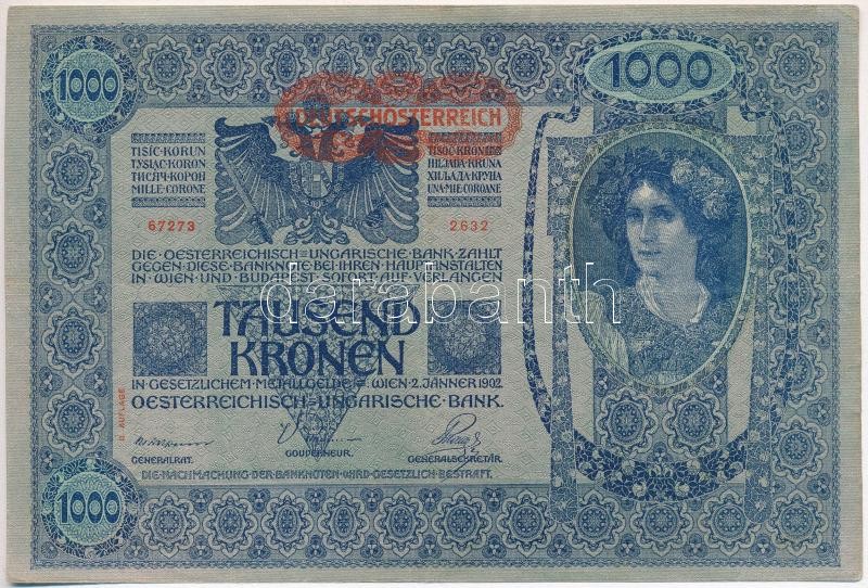 Leírás: 1919. (1902) 1000K vízszintes piros "DEUTSCHÖSTERRECIH" felülbélyegzéssel, hátlap rajzos T:III szép papír