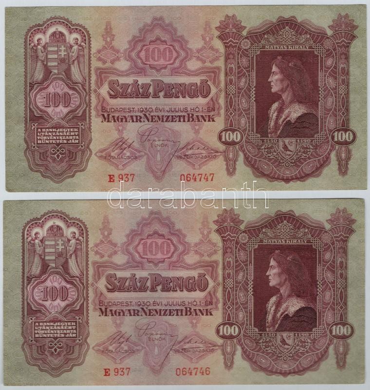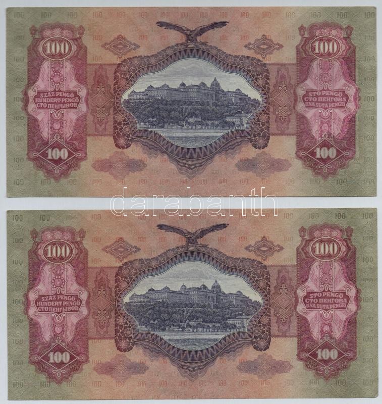1930. 100P (2x) sorszámkövetők T:II https://www.darabanth.com/hu/330-Gyorsarveres/330.0/Numizmatika/Magyar-bankjegyek~1000006/1930-100P-2x-sorszamkovetok-TII~II1840550