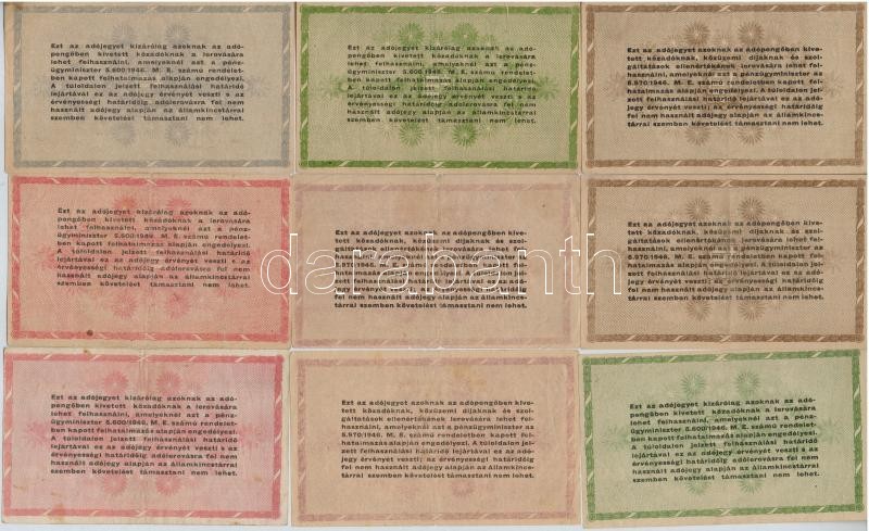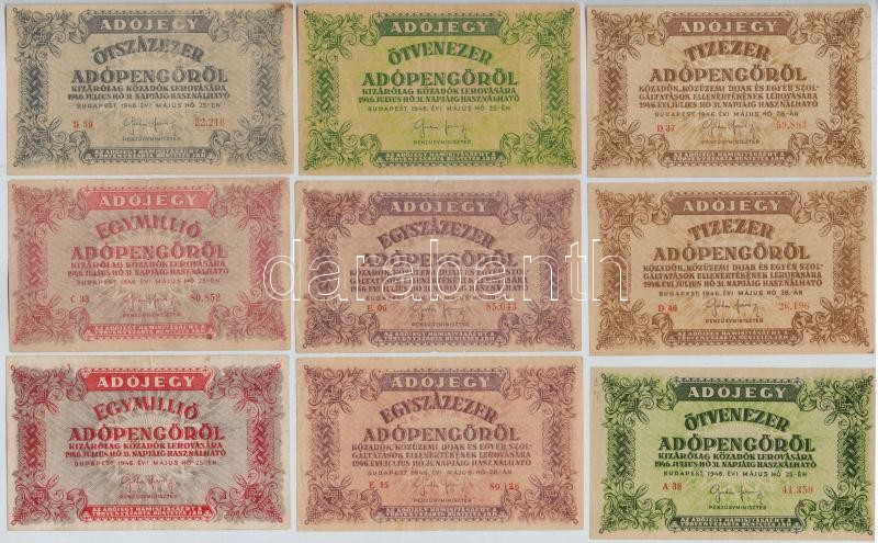 1946. 10.000AP (2x) + 50.000AP (2x) egyik sorszám nélkül + 100.000AP (2x) egyik sorszám nélkül + 500.000AP + 1.000.000AP (2x) egyik sorszám nélkül illetve fordított címerrel T:III