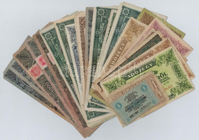 Leírás: 27db-os vegyes magyar korona, pengő, adópengő és forint bankjegy tétel, benne még néhány külföldi darab T:III,III-