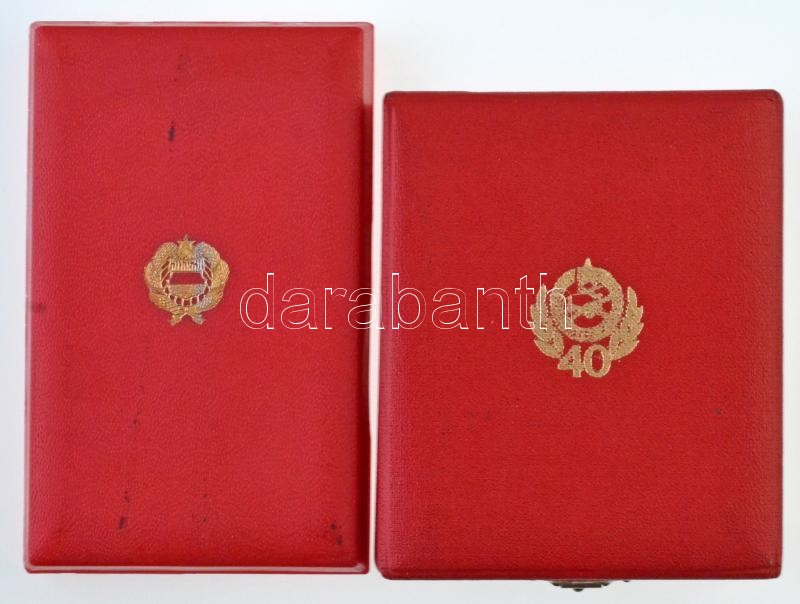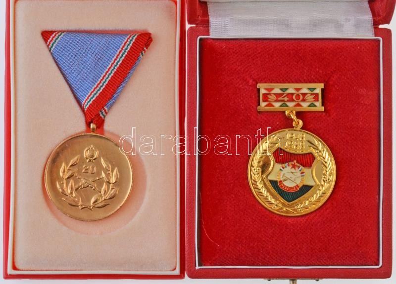 Leírás: ~1960-1980. "Honvédelmi Érdemérem 20 év" aranyozott fém kitüntetés mellszalagon, dísztokban + 1988. "MHSZ 40" aranyozott és részben zománcozott kitüntetés eredeti dísztokban T:1-,2
