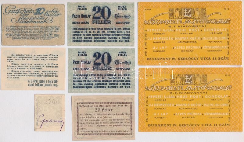 8db-os magyar és külföldi szükségpénz tétel, közte Budapest 1919. 20f "Központi Sajtóvállalat R.T."; ~1920. 20f "Pesti Hírlap"; Budapest 1919-1925. 20f "Virradat" pénztárjegy T:I-,II,III